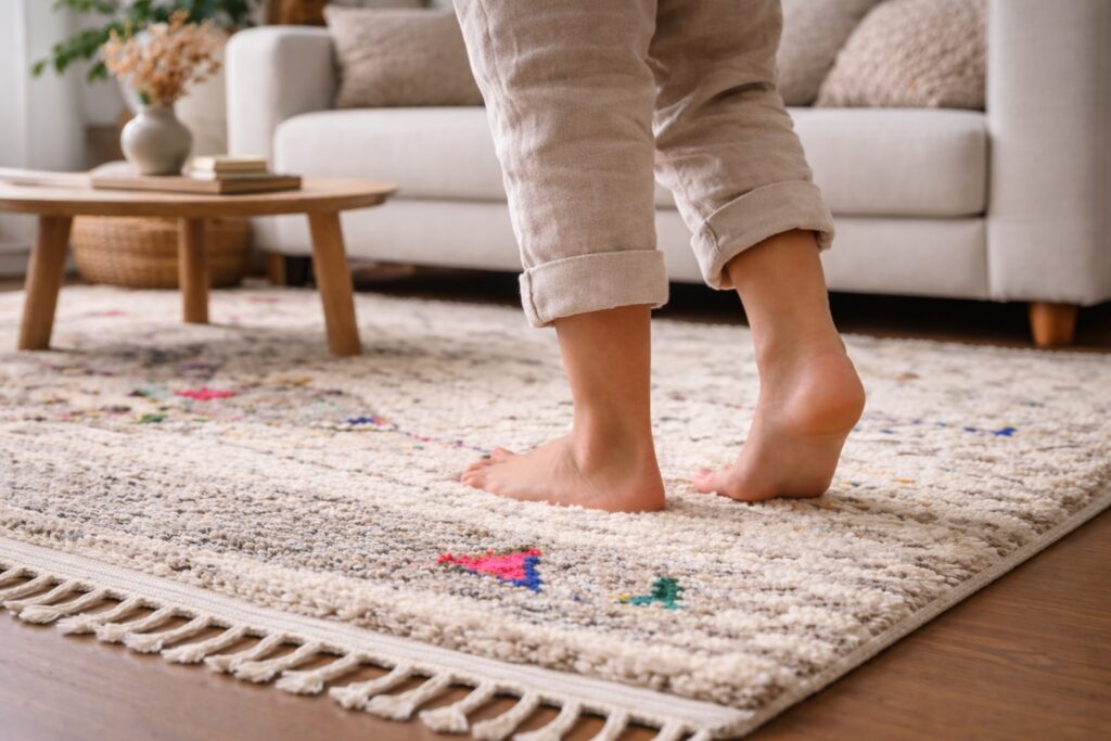 If you walk barefoot often, you notice the difference immediately. The rug cushions without collapsing. It holds its structure even in high-traffic areas.