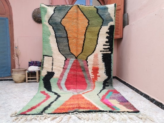 - Boujad vs Boucherouite Boucherouite rugs are made from recycled textiles and feel playful and chaotic. Boujad rugs are wool-based and structurally more grounded.
