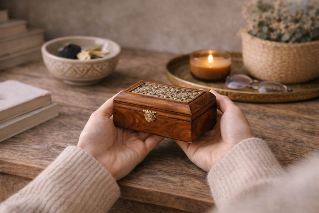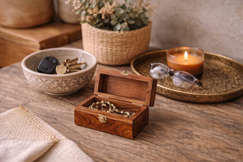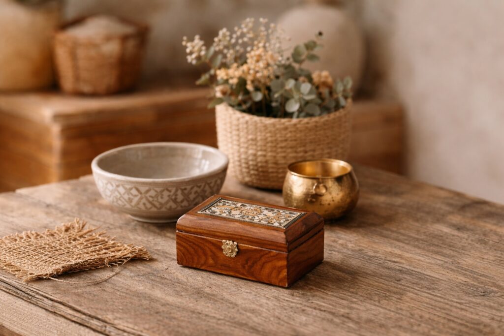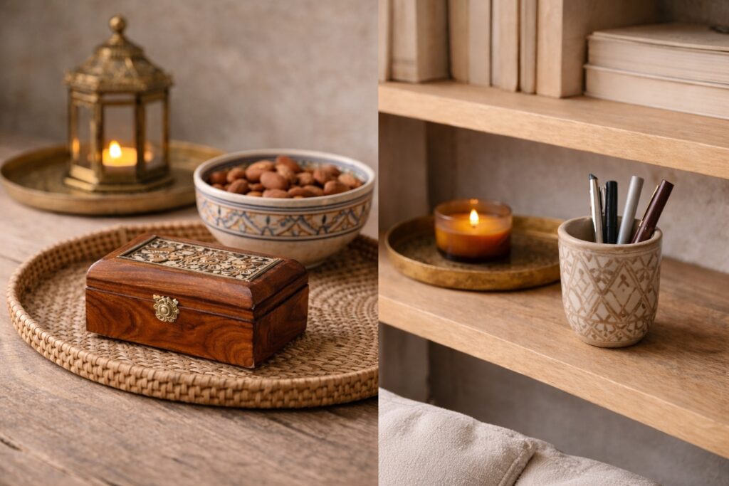 Thoughtful Moroccan decor gift arrangement featuring a small hand-carved wooden box, ceramic bowl, woven tray, and lantern—illustrating gift-friendly scale and everyday usability.