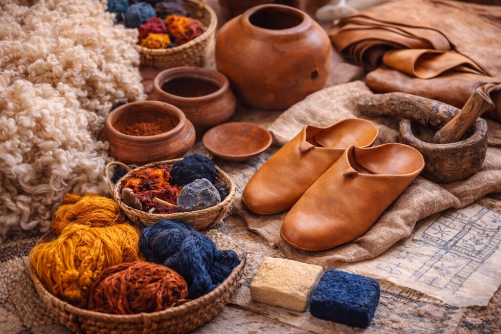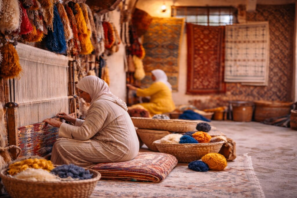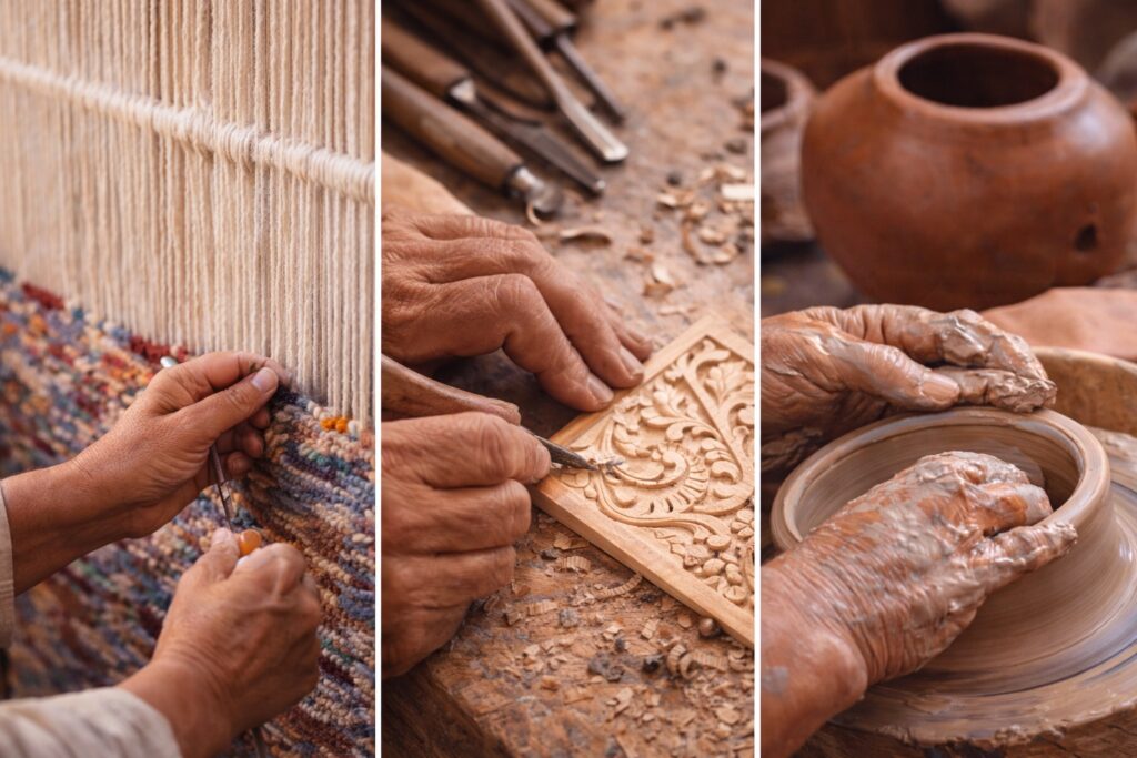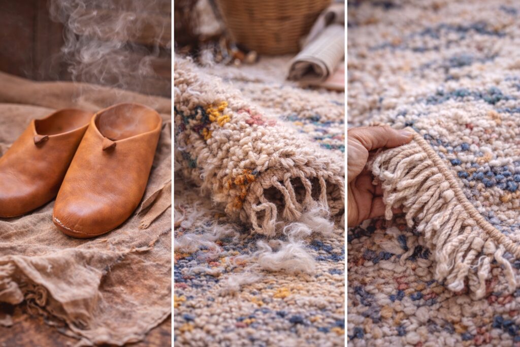 Visual guide showing Moroccan artisans weaving rugs, shaping clay pottery, working leather, and finishing handmade decor, illustrating the key questions to ask before buying Moroccan decor online.